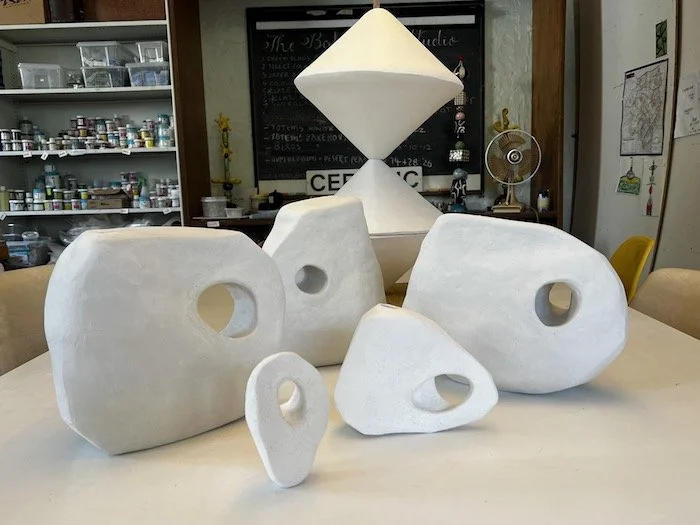 With temperatures in the studio staying wonderfully low, it’s been a good time to experiment with new shapes and forms, making moulds and utilising the home-made slab roller by @scott_made_that for some much larger totem beads and free-standing sculptures. I’m learning a lot from trial and error and, just like baking cakes, doubling the size or the recipe isn’t always successful and requires a change in methodolgies. I am certainly not rushing the drying process on these big pieces, so the process is a slow one. Below is a work-in-progress image of pre-fired and bisque fired forms currently under way.